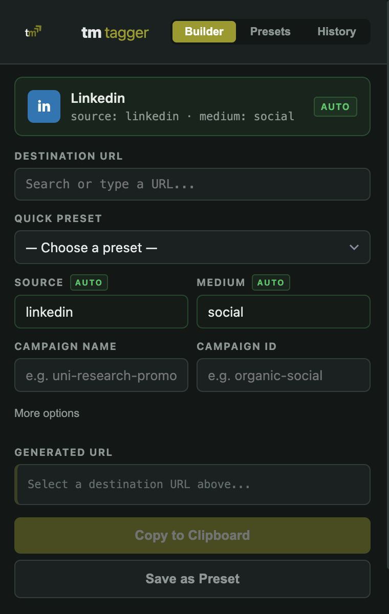 tm tagger detects the platform from the tab URL and auto-fills source + medium.